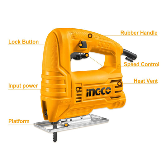 Ingco JS400285 Corded Jigsaw with 400W Motor - Variable Speed, Bevel Cutting, and Dust Removal System for Precision DIY and Professional Woodworking