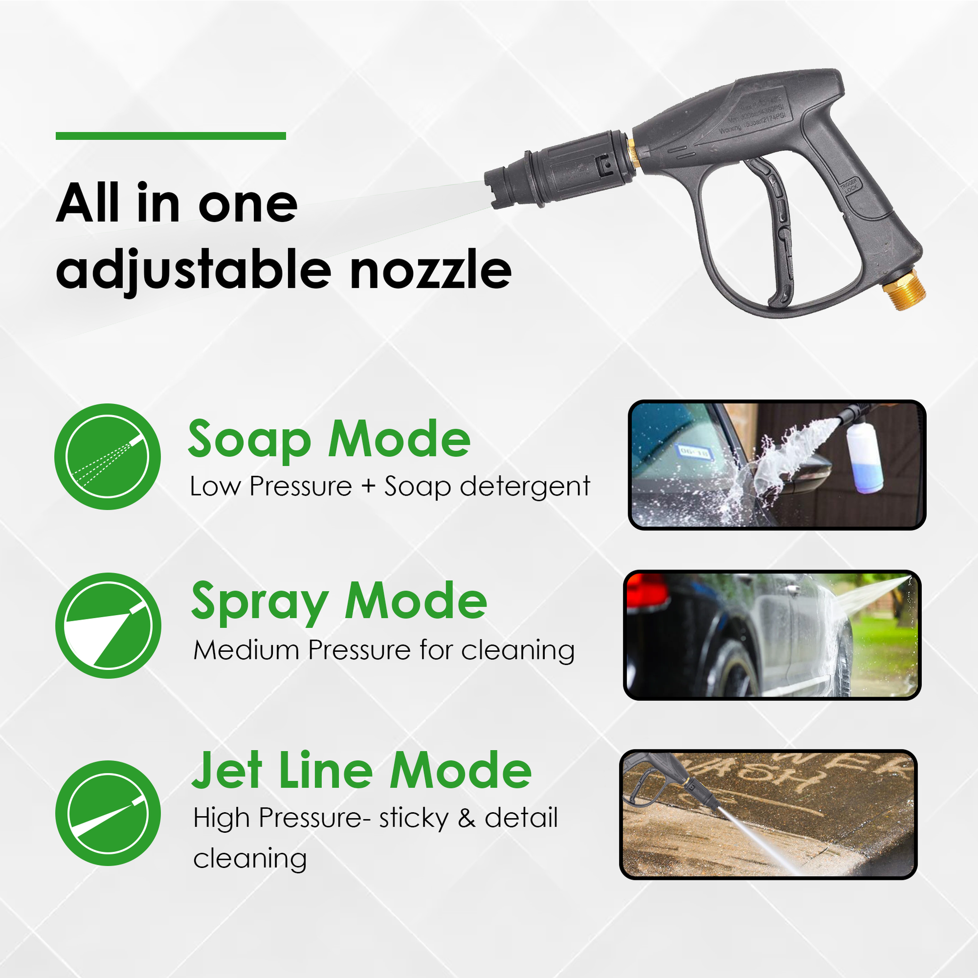 The Aegon APW-1500 Pressure Washer comes with an all-in-one adjustable nozzle that enhances the versatility and efficiency of your cleaning tasks. This innovative nozzle allows you to easily switch between different spray patterns to suit various cleaning requirements.