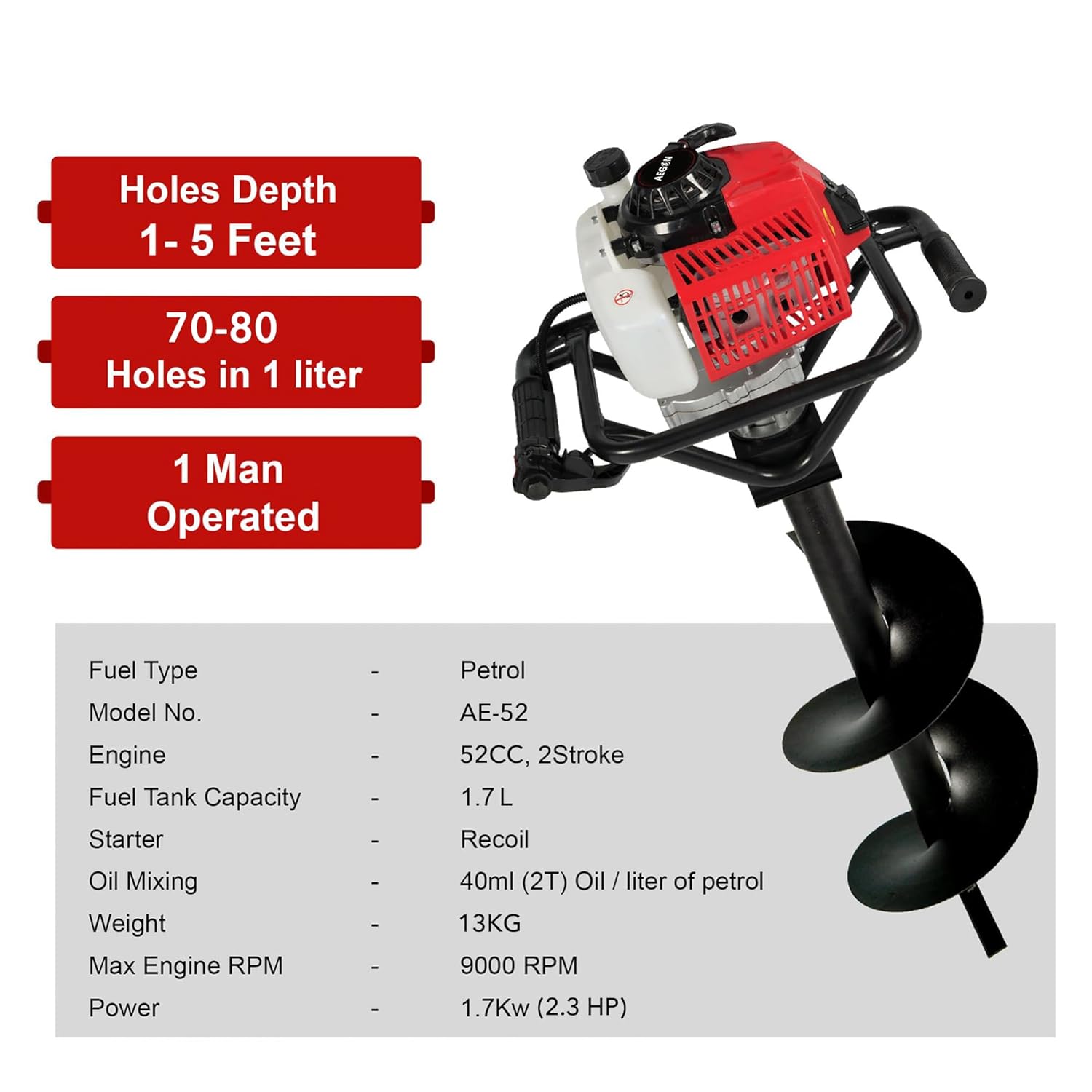 - Invest in the AEGON AEA52 Earth Auger and experience the convenience and power it offers for all your fencing, plantation, and hole-digging needs. With its heavy-duty engine and versatile capabilities, this earth auger is the ultimate tool to make your projects easier and more efficient.