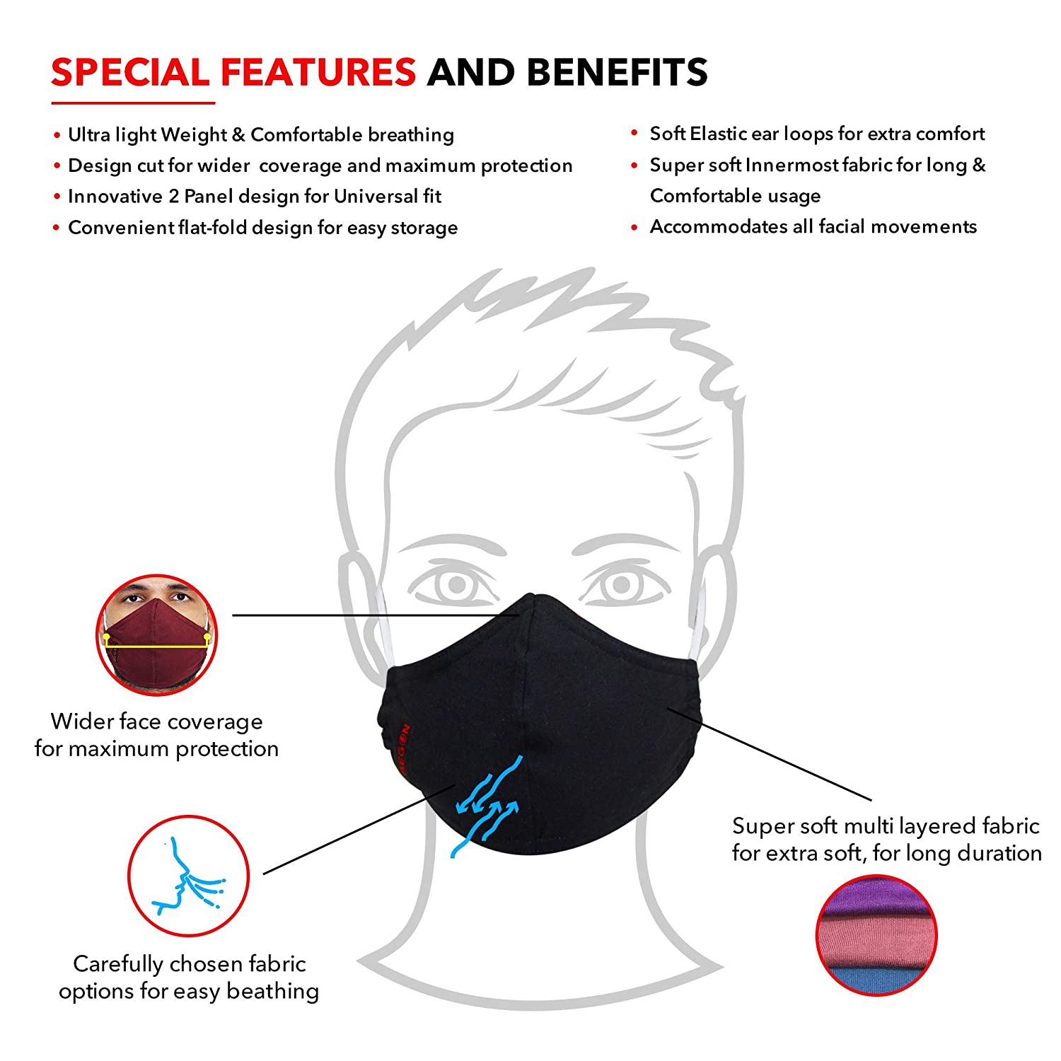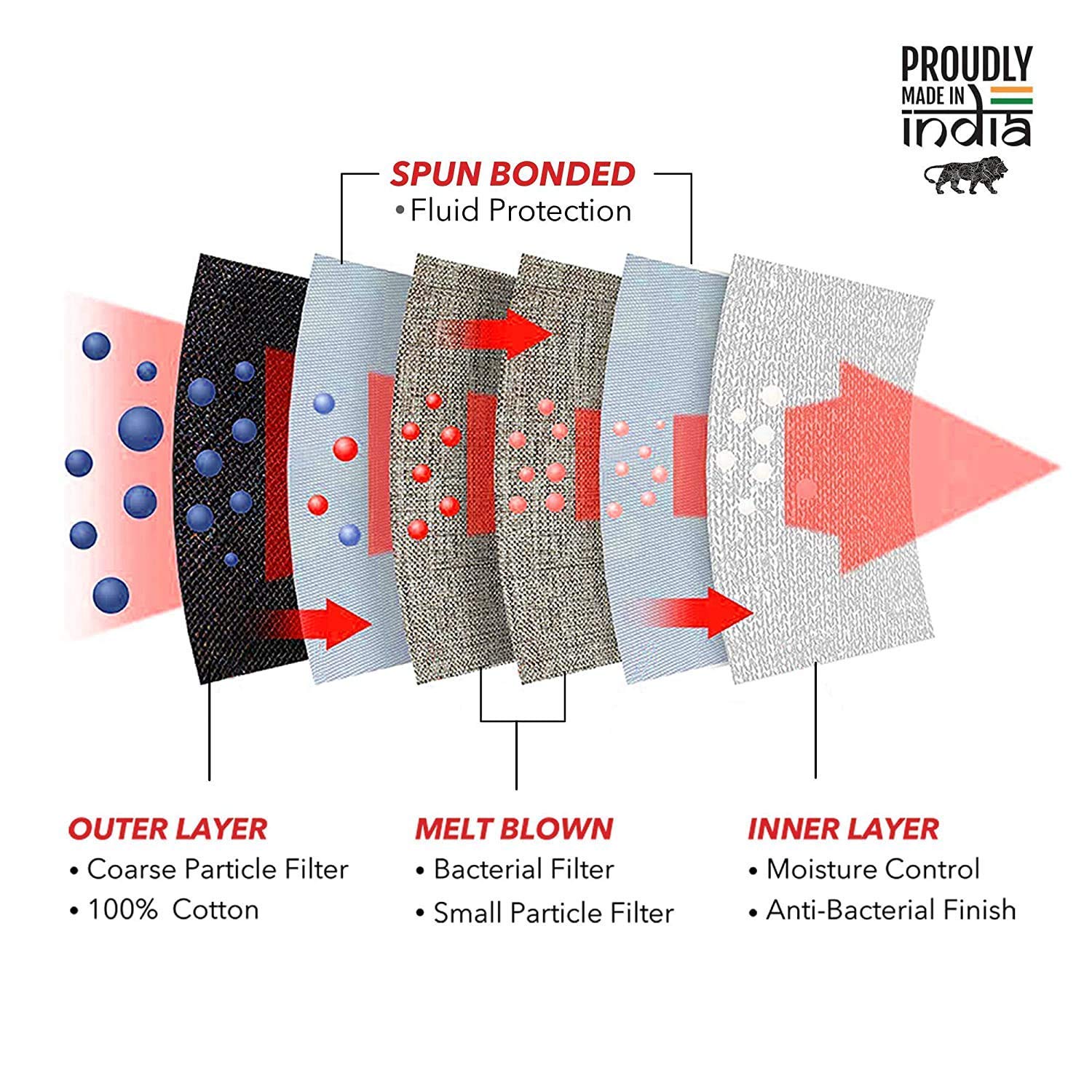 Features: This mask is made with 100 percent cotton material and features moderately soft SMMS fabric for extra comfort. It incorporates a 6-layered triple filtration system, including SMMS and meltblown layers, to provide effective particle filtration. The mask offers a particulate filtration efficiency of 93% at 0.3 microns, as well as a bacteria filtration efficiency (BFE) of 95%+ at 3µm (micron). It comes with soft, elastic ear loops for added comfort and does not have a nose pin, allowing for extended wearing without discomfort.