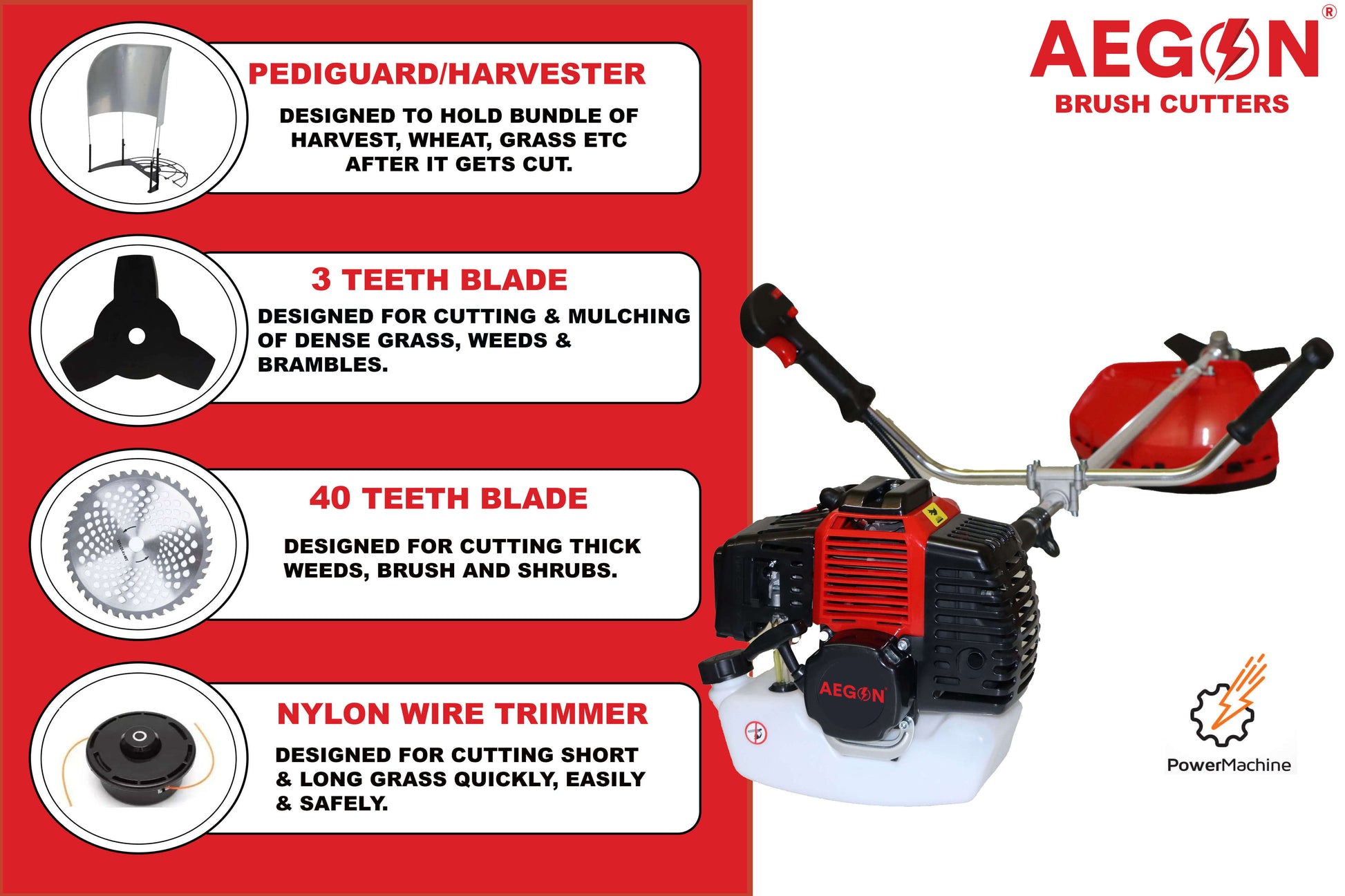 Introducing the Aegon Brush Cutter, your versatile solution for all your lawn, garden, and agricultural needs. This lightweight, multipurpose machine excels in agriculture, horticulture, and lawn garden maintenance, including tasks like crop cutting (wheat, rice, sugarcane, soybean), animal feed processing, grass trimming, and weed removal with the additional weeder attachment.