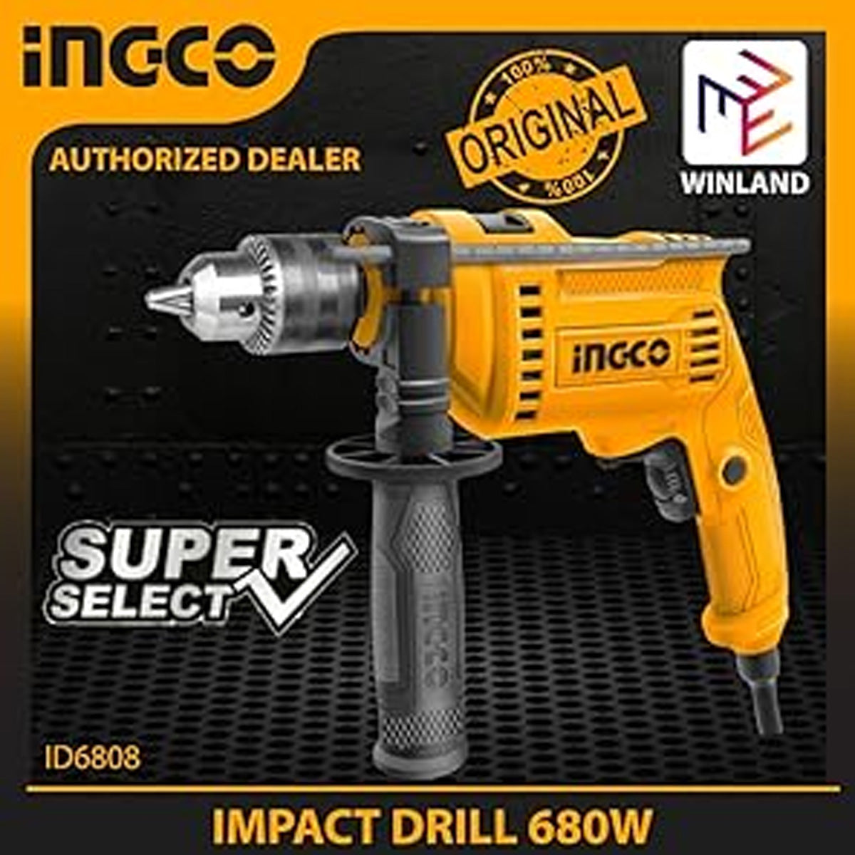 Ingco ID6808 Percussion Drill - Professional 680W Hand-Operated Tool with Reversible Variable Speed and Lock Speed Button