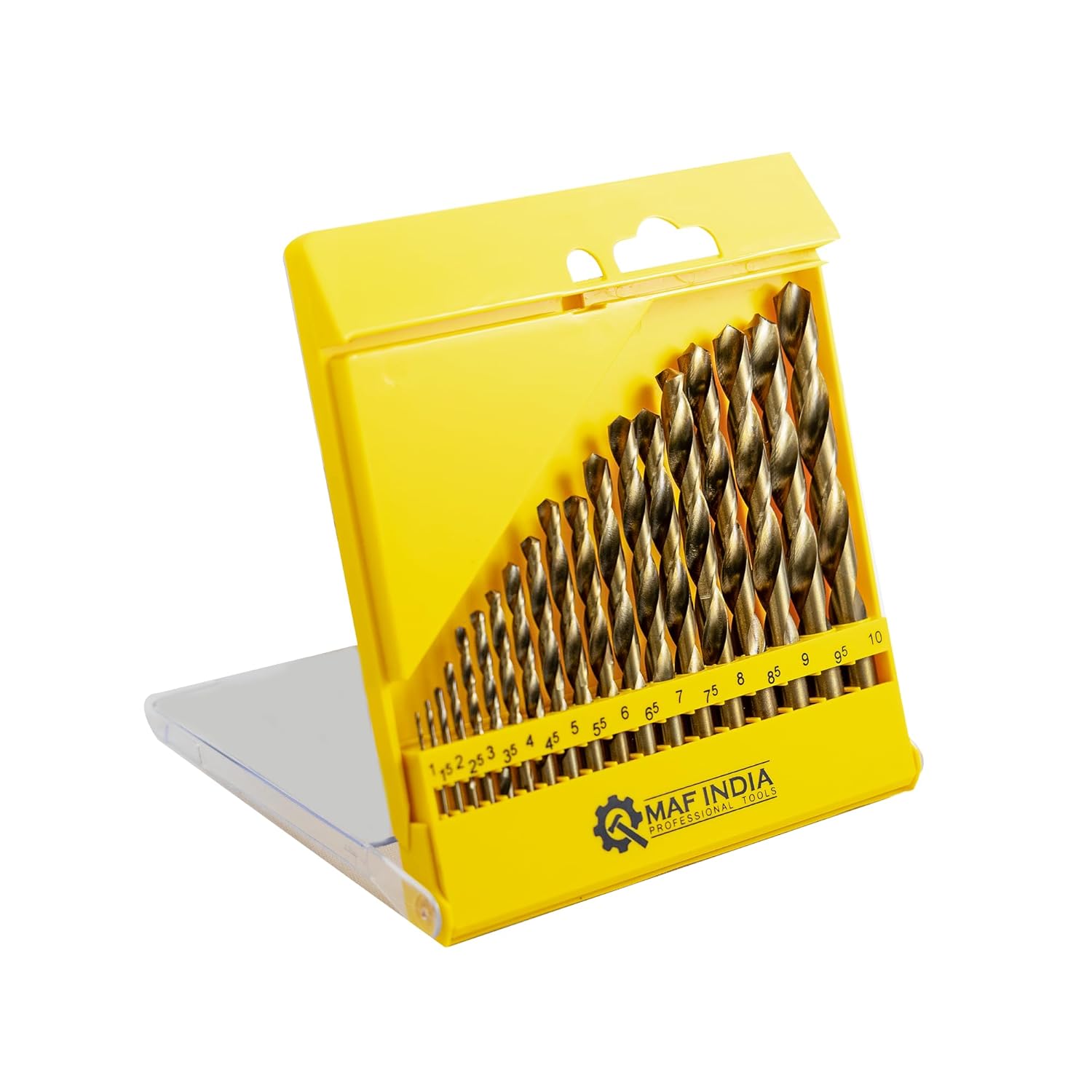 • Size: 1,1.5,2,2.5,3,3.5,4,4.5,5,5.5,6,6.5,7,7.5,8,8.5,9,9.5,10mm; 19pcs HSS twist drill bits set Packed by plastic box