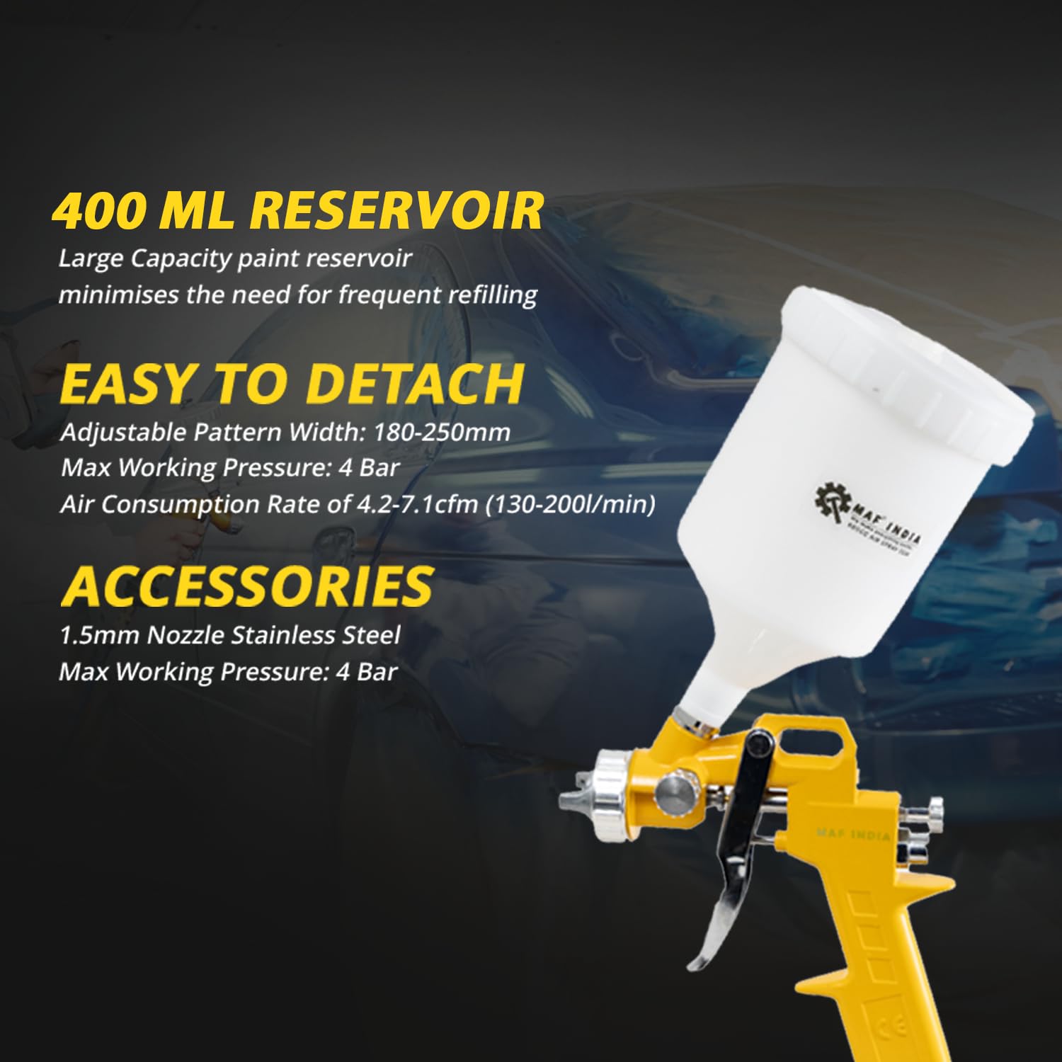 MAF PRO ASG6006 Air Spray Gun, 400ml Capacity | 1.5mm Nozzle Stainless Steel | 3-4 Bar Pressure | Suitable for Base Coat Spray Gun for Auto Paint