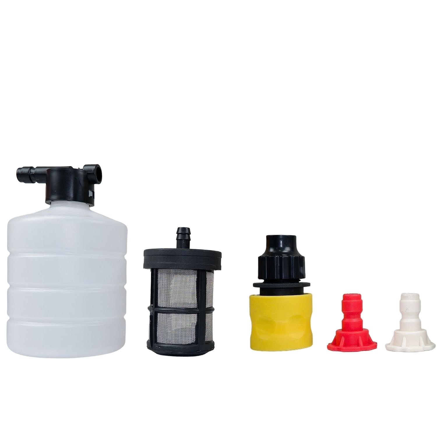 • Package Contents: 1 High-pressure washer, 2 Batteries, 1 Charger, 1 Nozzle Extension rod, 1 Water supply hose (5m), 1 Foam bottle, 4 Water connectors