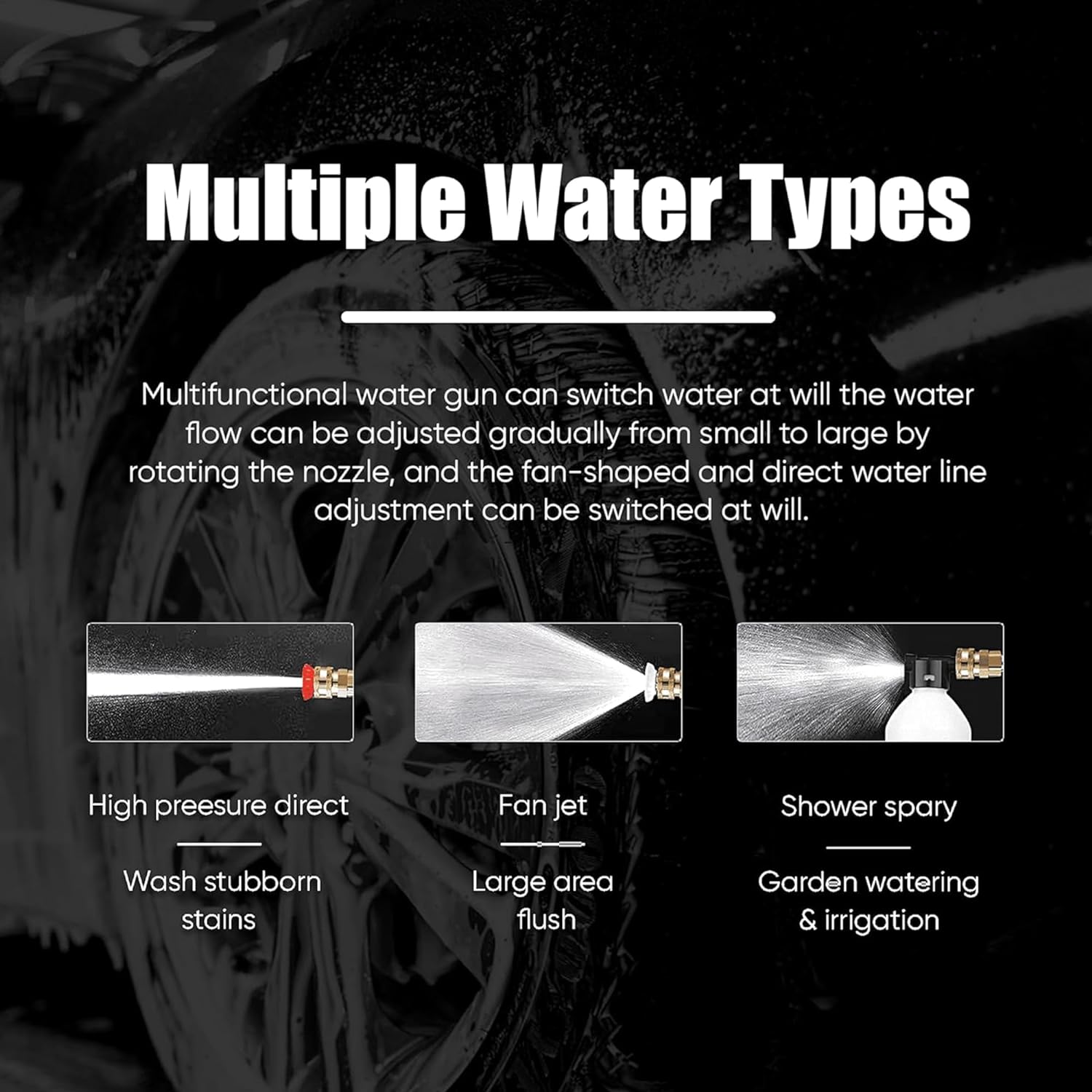 • The nozzle design is humanized, featuring two different quick-connect nozzles. You have the flexibility to choose the appropriate nozzle based on your specific cleaning needs, helping you save water. Additionally, we provide a foam spray can for deep cleaning of cars, making car washing more convenient.