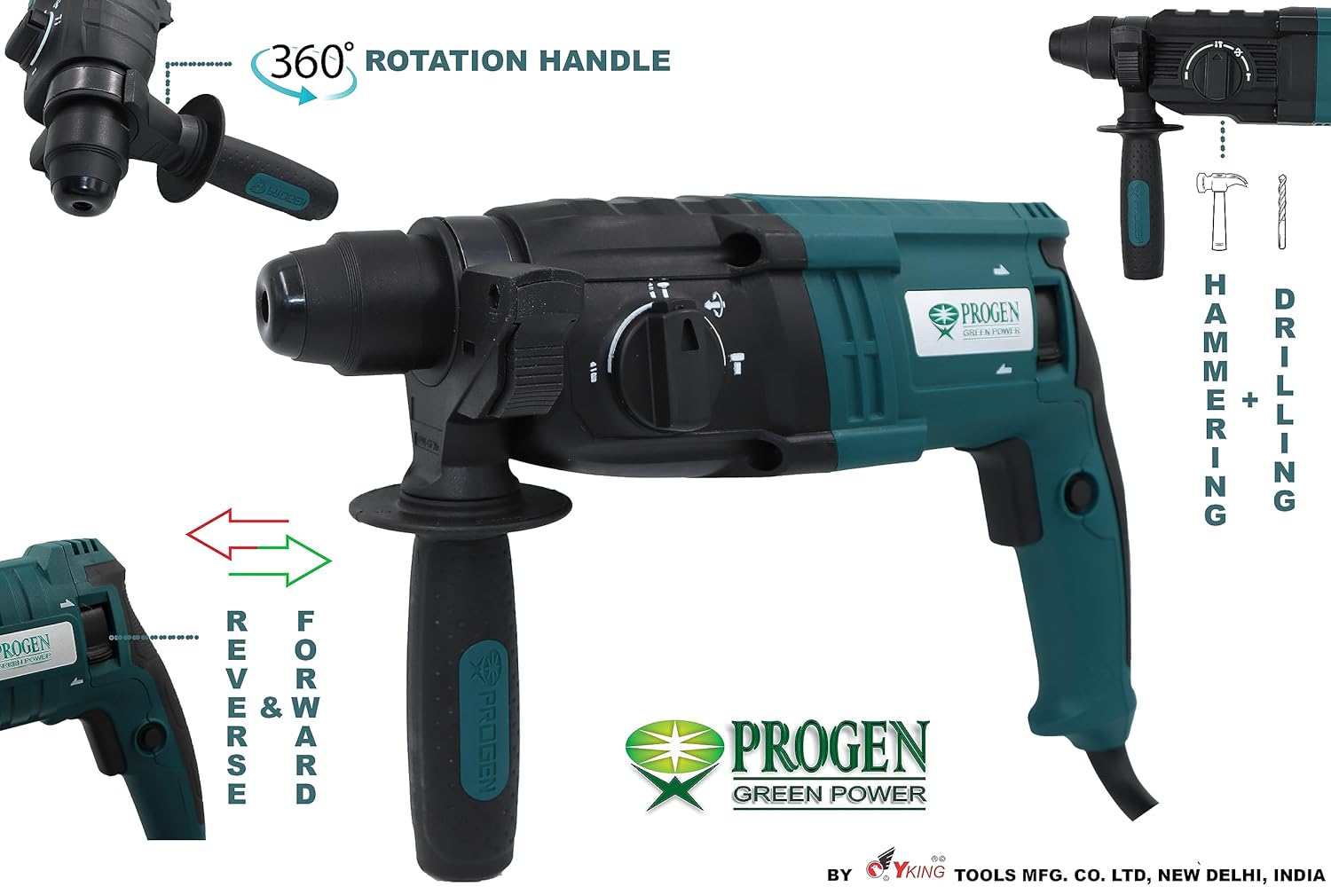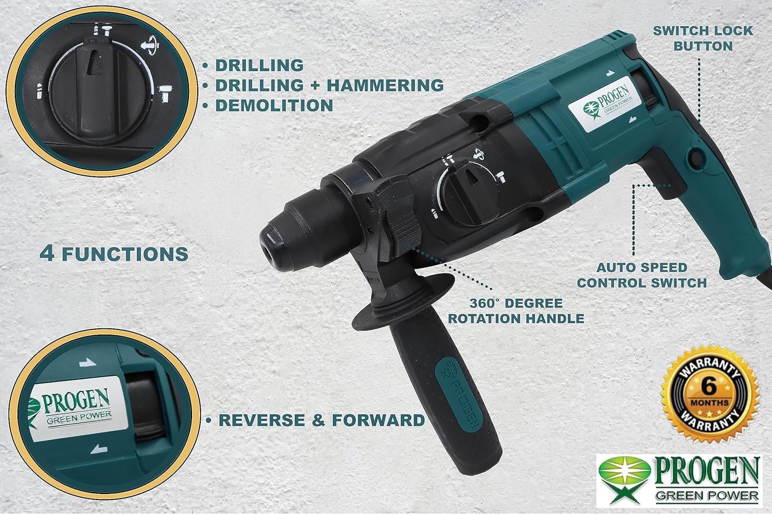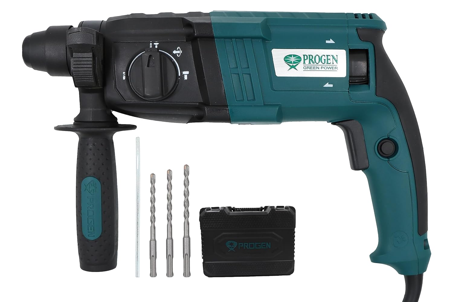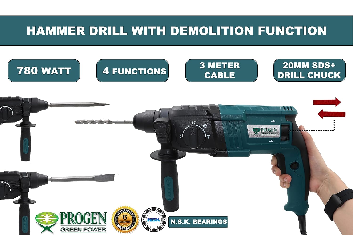 PROGEN 9220-HG 780W 20mm Rotary Hammer Drill Machine, SDS Plus Shank, Variable Speed, Reversible 4 Functions with 3 Bits For Hammering & Drilling on Concrete, Masonry & Wood (3900 bpm, 2000 Rpm)